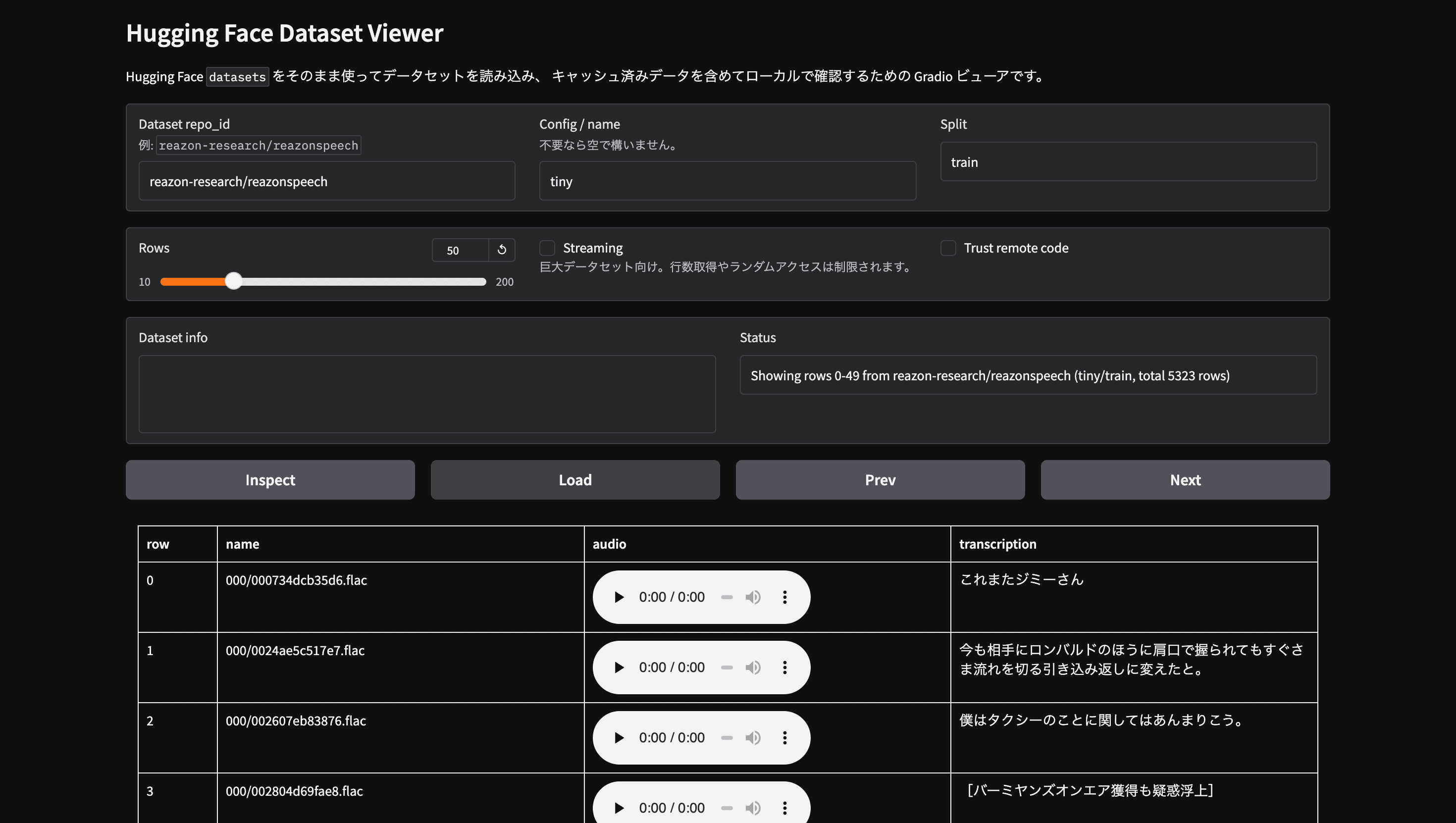 ReazonSpeechが公式Viewerから見えないので、ローカル環境でどんなデータセットか確認できました。